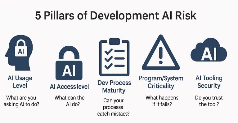 Each pillar represents a different axis of AI development risk — not overlapping categories, but independent dimensions. Tiering within each pillar gives you a structured way to build a composite view of your overall risk posture.